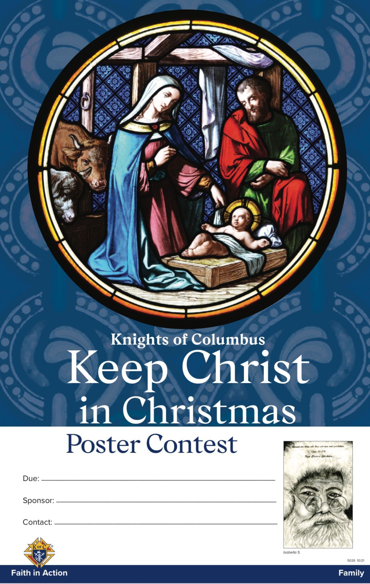 For the 5th consecutive year, the Knights of Coumbus, St. Ignatius of Antioch Council #7621 will be conducting the "Keep Christ in Christmas" Poster Contest for the youth of our parish. There will be 5 age group categories: Kindergarten, 1st & 2nd grade, 3rd & 4th grade, 5th & 6th grade, and 7th & 8th grade. Prizes will be awarded for 1st, 2nd, and 3rd place. Poster paper is in the Faith Formation Office or upon request.