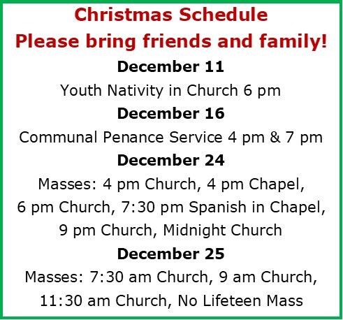 Saturday: after the 9:00 AM Mass or upon request